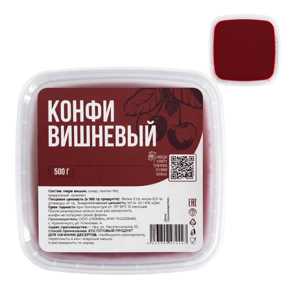 Способ применения: Это готовый продукт для начинки десертов. Необходимо разморозить, переложить в кондитерский мешок и распределить по коржу. Оптимальная толщина слоя конфи 7 мм.